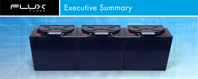 | ABOUT FLUX POWER | Flux Power, Inc. (Flux) is an innovator in providing lithium energy storage solutions to several energy storage markets including; lead acid battery replacement, electric vehicle, backup power, and the wind and solar power markets. Flux’s lithium energy power solutions are based on proprietary, patented technology. The Company’s solutions are their Intelligent Battery Management System Modules, charging systems and energy monitoring and display solutions for large format lithium cells. Flux Power’s technology enhances lithium batteries into storage solutions for today and tomorrow. When compared to unmanaged energy storage solutions, Flux’s Battery Management Systems enable up to a five times increase in battery cycle life, which equates to thousands of charge/discharge cycles and years of use. This substantial increase in battery life longevity allows Flux Power to utilize the highest production volume, lowest cost lithium batteries in their solutions, while enhancing these batteries to perform equivalent to, or better than, high cost, high performance lithium batteries at a fraction of the price. Flux has shipped over 14 megawatts of energy solutions since it launched their solutions in 2010. | |