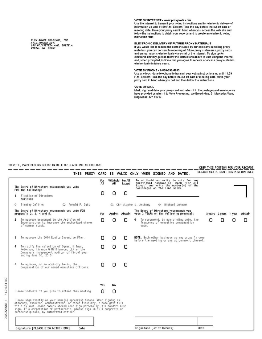 The Board of Directors of Flux Power Holdings, Inc., a Nevada corporation, seeks your proxy for use at our 2015 Annual Meeting of Stockholders (or any adjournment, postponement or rescheduling thereof) to be held on February 17, 2015, at 10:00 a.m. Pacific Standard Time. Our Annual Meeting will be held at our corporate offices located at 985 Poinsettia Avenue, Suite A, Vista, California 92081. The approximate date on which this Proxy Statement and the accompanying proxy card are first being sent or given to stockholders is January 8, 2015. Unless the context requires otherwise, references to the “Company,” “we,” “us” or “our” in this proxy statement refer to Flux Power Holdings, Inc. and its subsidiaries.