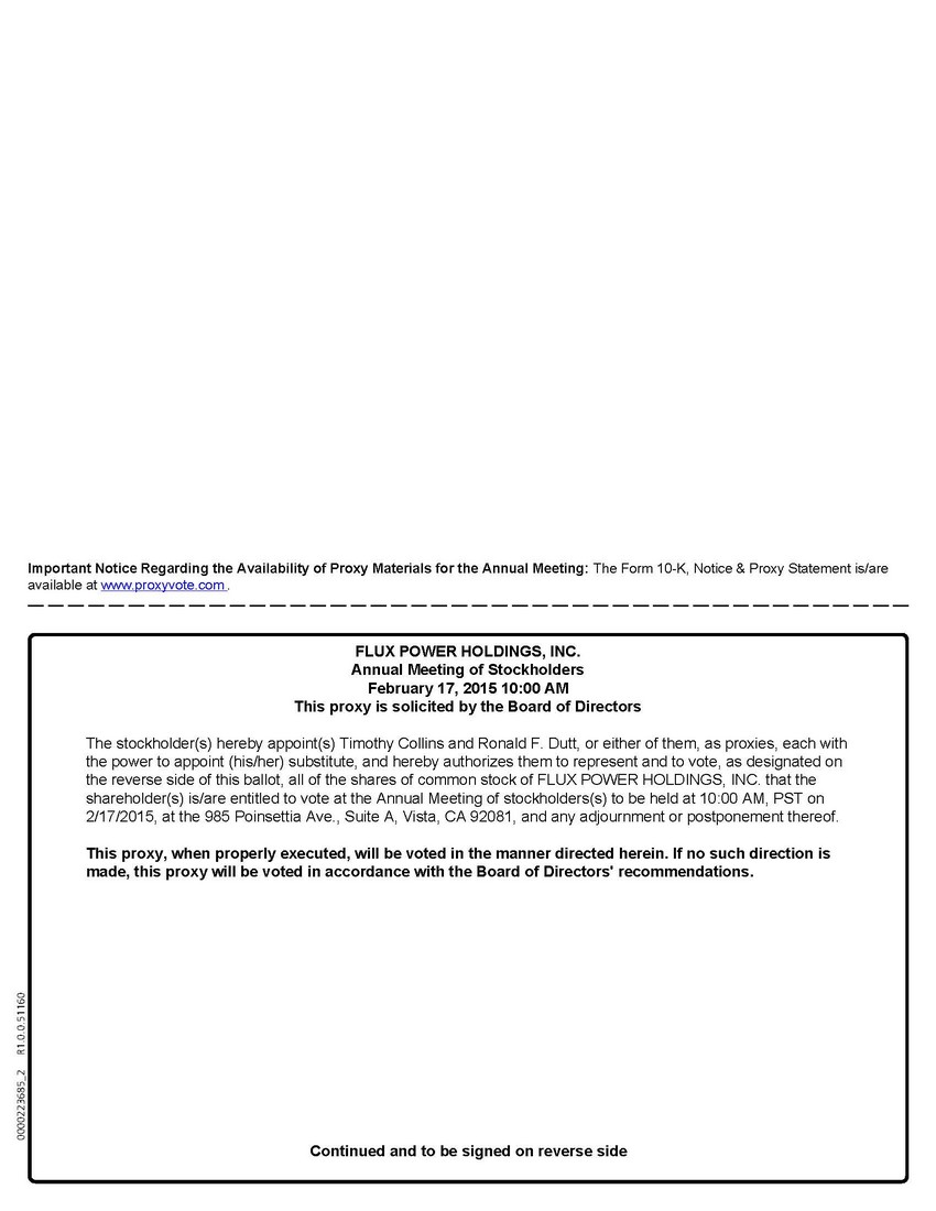 On behalf of the Board of Directors of Flux Power Holdings, Inc., I invite you to attend our 2015 Annual Meeting of Stockholders (“Annual Meeting”). We hope you can join us. The Annual Meeting will be held at our corporate offices located at 985 Poinsettia Avenue, Suite A, Vista, California 92081, on February 17, 2015 at 10:00 a.m. Pacific Standard Time.