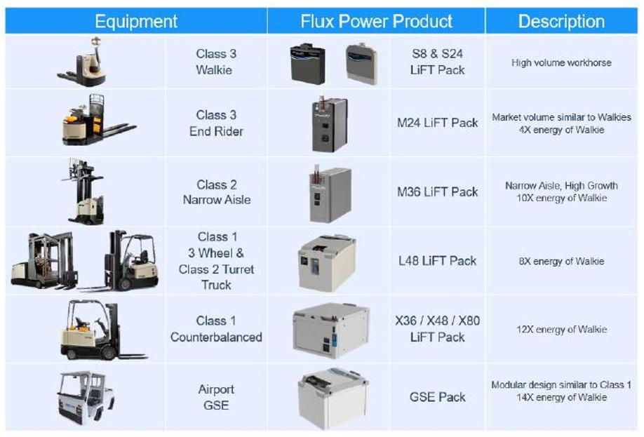 We have developed, tested, and sold our LiFT Packs for use in a broad range of lift trucks, including Class 3 Walkie and End Riders, Class 2 Narrow Aisle, and Class 1 Ride-on, as well as for airport GSE, as outlined below. Recent product sales have now include initial sales for lithium-ion packs for solar energy storage for mobile charging stations and warehouse robotics, using our modular, scalable designs.