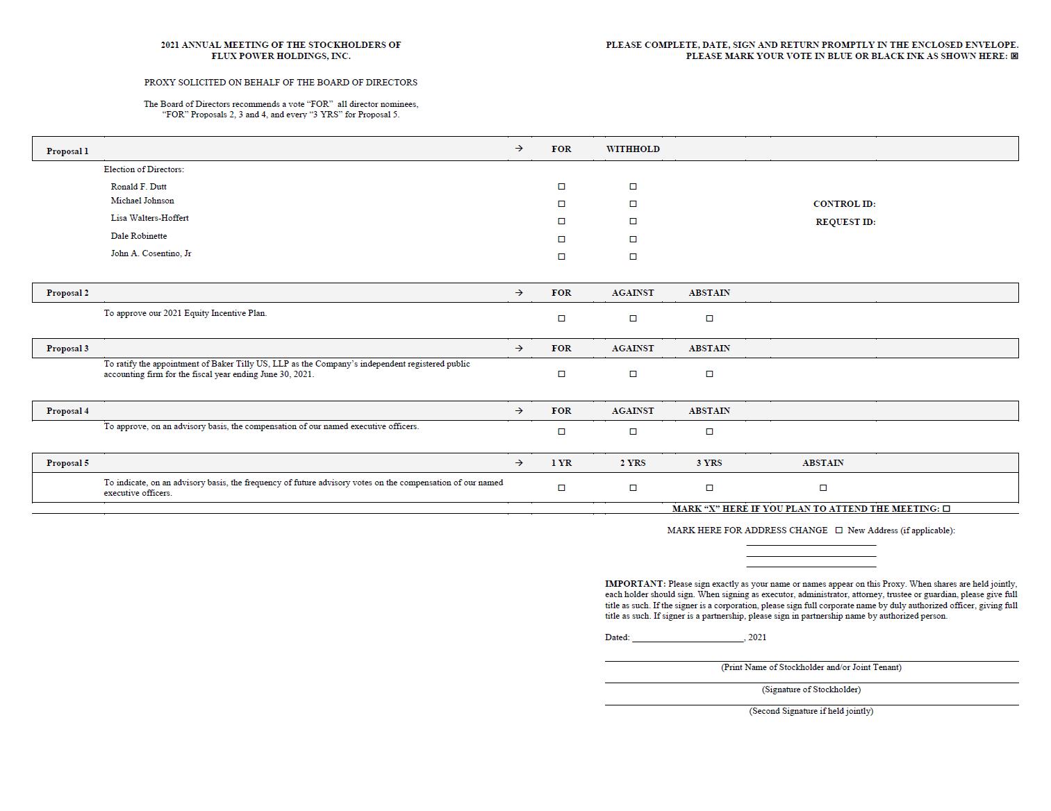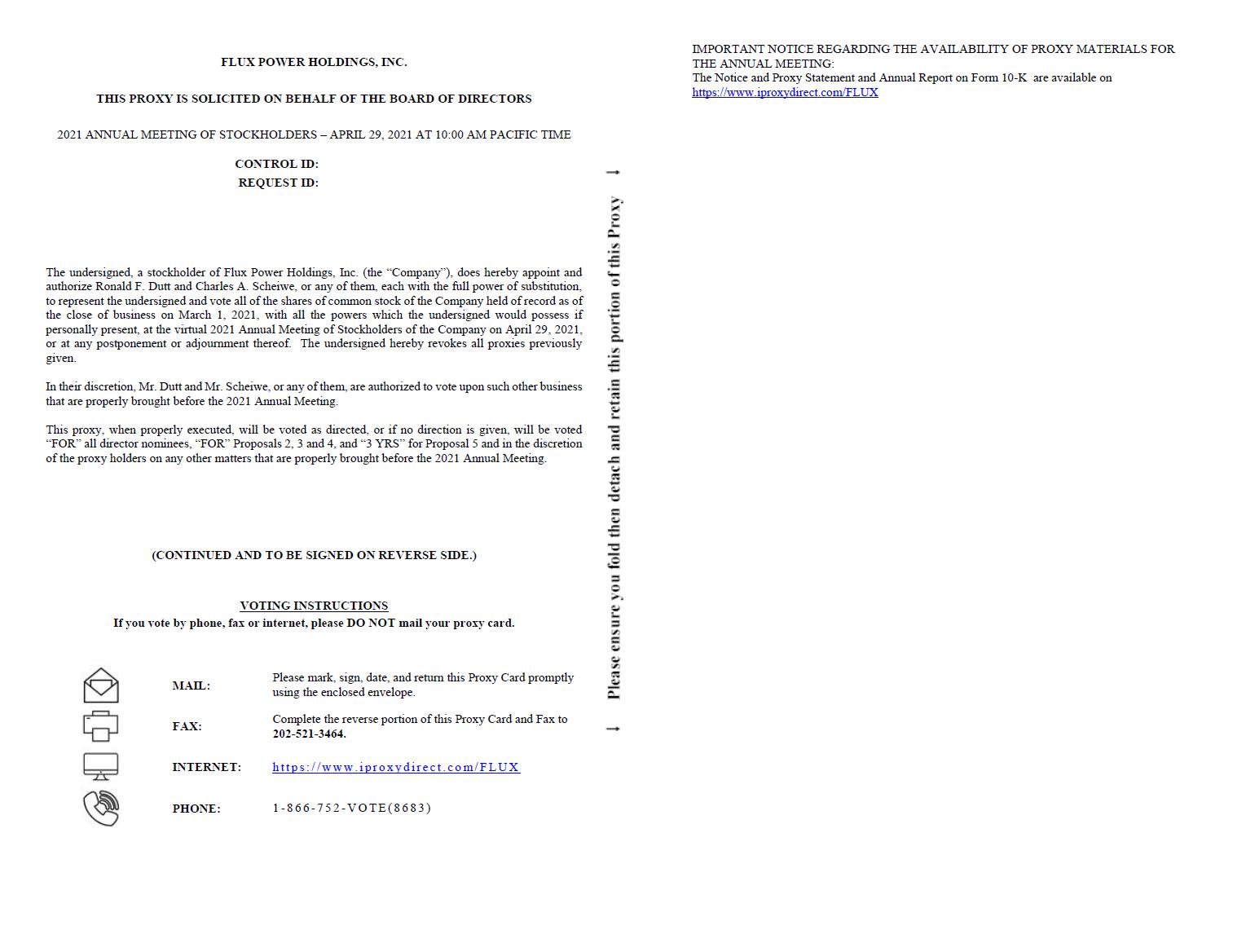 You are cordially invited to attend the Annual Meeting of Stockholders of Flux Power Holdings, Inc., or Annual Meeting. We will be conducting the 2021 Annual Meeting as a virtual meeting. The virtual meeting format will allow for greater participation by all of our stockholders, regardless of their geographic location. The Annual Meeting will be held at 10:00 a.m. Pacific Standard Time, on Thursday, April 29, 2021 via a live webcast on the internet.
