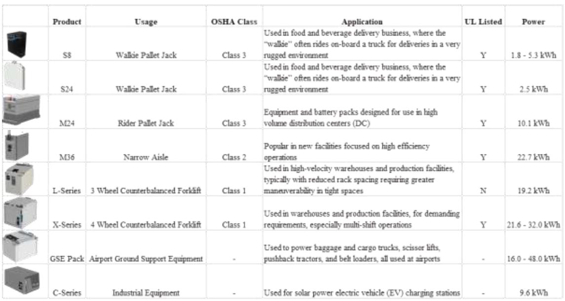 Broad product offering and scalable design: We offer LiFT Packs for use in a variety of industrial motive applications. We believe that our modular and scalable design enables us to optimize design, inventory, and part count to accommodate natural product extensions of our products to meet customer requirements. We have leveraged our Class 3 Walkie LiFT Pack design to develop larger LiFT Packs for larger forklifts, GSE Packs, and other industrial equipment applications. Natural product extensions, based on our modular, scalable designs, include solar backup power for electric vehicle (“EV”) mobile charging stations and robotic warehouse equipment.