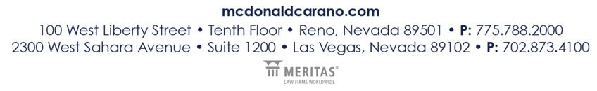 This opinion is issued in the State of Nevada. By issuing this opinion, McDonald Carano LLP (i) shall not be deemed to be transacting business in any other state or jurisdiction other than the State of Nevada and (ii) does not consent to the jurisdiction of any state other than the State of Nevada. Any claim or cause of action arising out of the opinions expressed herein must be brought in the State of Nevada. Your acceptance of this opinion shall constitute your agreement to the foregoing.